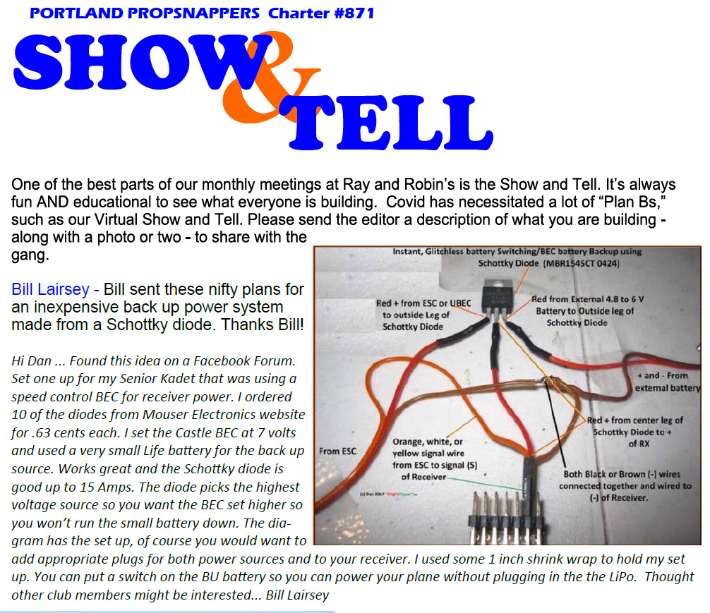• Field Clean-Up Apr 11, Rain 18, (Club Field ) Time to get the field set up for the season. Volunteers bring rakes and shevels. Bring a plane too for after clean up. Coordinator: David Dyer